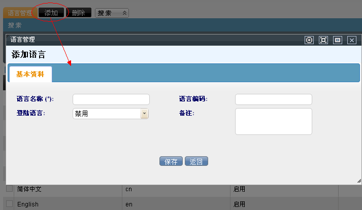 系统管理界面下,系统设置–语言管理,打开添加语言界面: