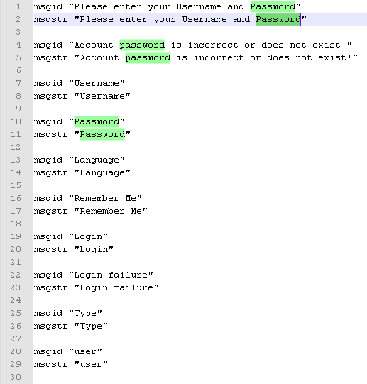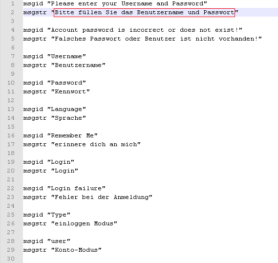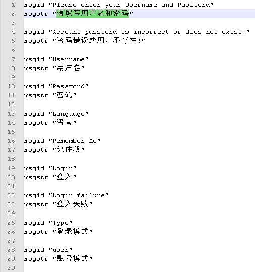 这里我们拿德语来举例,以登陆界面为例在LC_MESSAGES文件夹下修改login文件下的PO文件