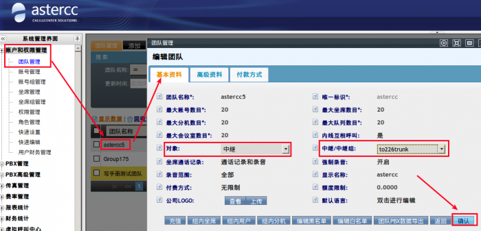 以A为例,将中继绑定给分机所属团队,供外呼使用。点击左侧管理列表[账户和权限管理]→[团队管理],双击团队数据,打开编辑页面,绑定完成后点击[保存]按钮,如下图:
