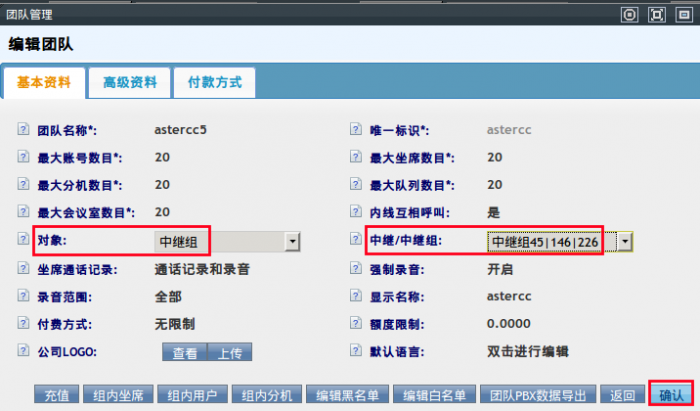 将刚才创建的中继绑定给分机所属团队,假如团队已经绑定中继,则需要将这两(多)个中继放到一个中继组下,然后将中继组绑定给团队即可。
