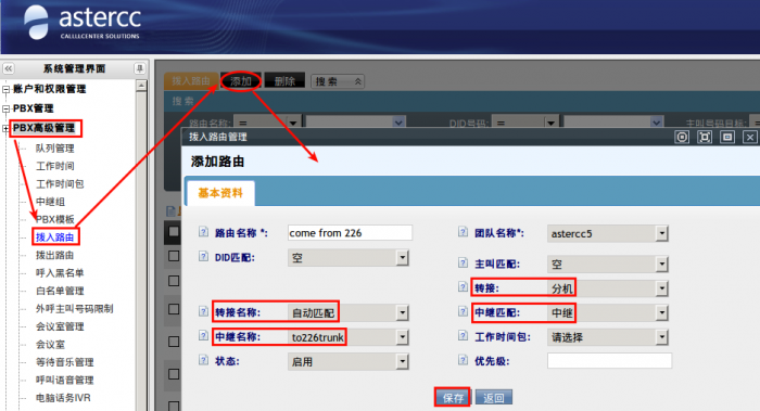 以在A上创建拨入路由为例进行演示,点击左侧管理列表[PBX高级管理]→[拨入路由]→[添加]按钮,打开拨入路由添加页面,如下图: