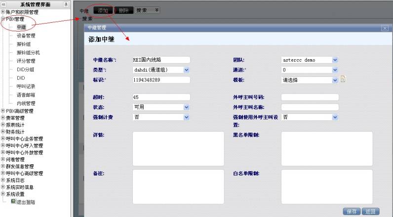 管理系统 左侧列表 选择 PBX管理–>中继