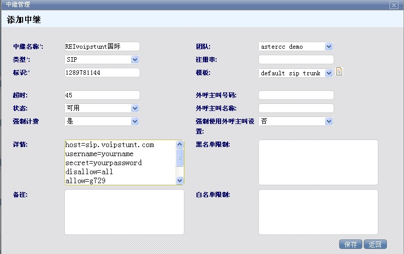 再添加一条国际线路中继,用于拨打国际长途。我们使用的是voipstunt。
