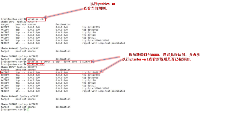 iptables -I INPUT -p tcp --dport 8080 -j ACCEPT(注意 dport 前面两个"-"号)INPUT链首行添加tcp协议端口8080设置为允许。