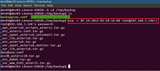 scp -rp /var/lib/asterisk/* root@192.168.1.146:/var/lib/asterisk ,然后输入密码 scp -rp /var/spool/asterisk/voicemail/* root@192.168.1.146:/var/spool/asterisk/voicemail scp -rp /var/spool/asterisk/monitor/* root@192.168.1.146:/var/spool/asterisk/monitor scp -rp /usr/lib/asterisk/* root@192.168.1.146:/usr/lib/asterisk scp -rp /etc/asterisk/* root@192.168.1.146:/etc/asterisk scp -rp /etc/dahdi/* root@192.168.1.146:/etc/dahdi scp -rp /opt/asterisk/scripts/astercc/* root@192.168.1.146:/opt/asterisk/scripts/astercc scp -rp /var/www/html/asterCC/* root@192.168.1.146:/var/www/html/asterCC scp -rp /var/lib/sounds/* root@192.168.1.146:/var/lib/sounds