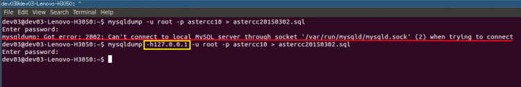 mysqldump -h127.0.0.1 -uroot -pastercc astercc10 > astercc20150302.sql