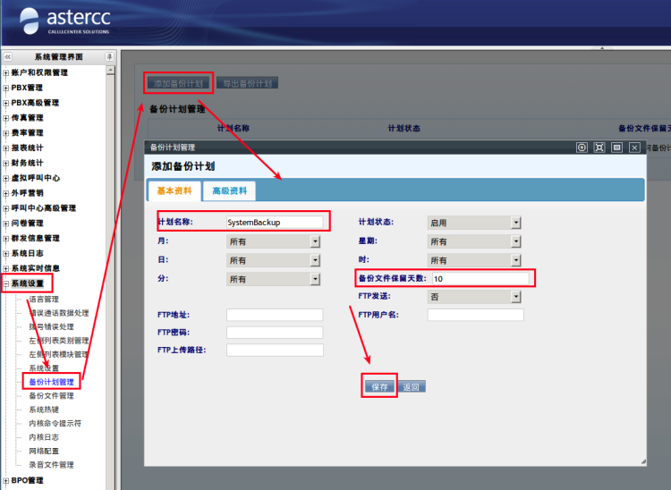 点击左侧的[系统设置]→[备份计划管理]→[添加备份计划],计划名称:用来区分备份的系统文件。备份文件保留天数,这项是务必填写的,根据自身机器设备的内存、硬盘来自由决定