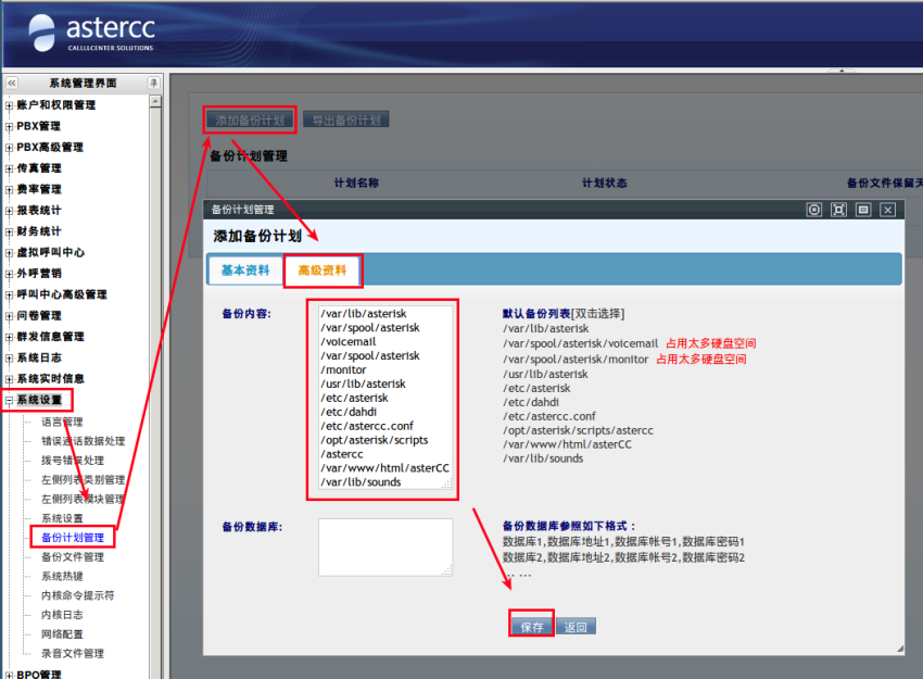 再看[高级资料],“双击”选择要备份的系统配置文件内容,建议全部选择,一共十个文件。根据备份数据库”格式“输入需要备份的数据库,格式的说明请阅读:备份计划管理