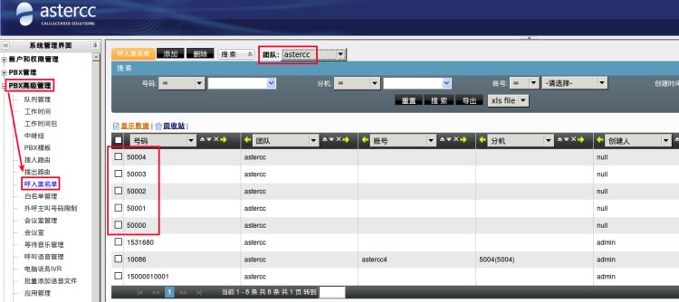 当导入计划管理状态变为“完毕”后,可以到[PBX高级管理]→[呼入黑名单]中的对应团队下,查看添加进来的限制号码,如下图: