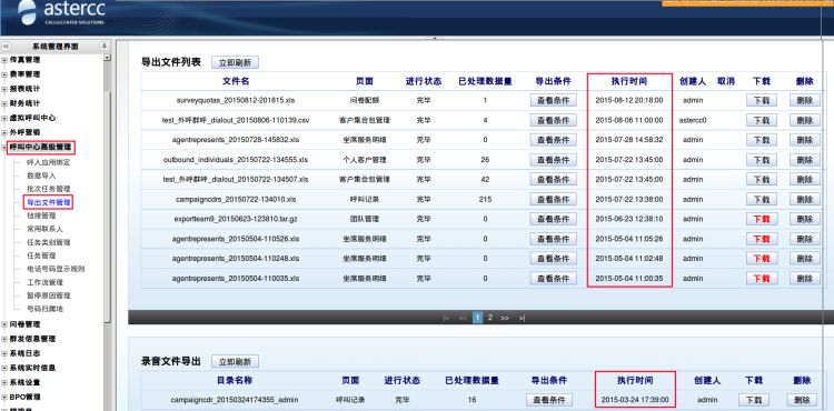 清除此计划列表数据,需要登录后台数据库,执行以下命令,其中xxx.xxx.xxx.xxx为数据库服务器IP,root是数据库的用户名,astercc为密码,astercc10是数据库库名,此计划的数据存储在名叫:cc10_shellexports 的数据表中: