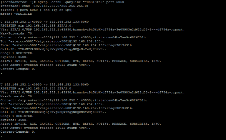 ngrep -deth0 -qWbyline "^REGISTER" port 5060这个命令将列出所有到达eth0 5060端口的REGISTER包(用于注册或者注销)