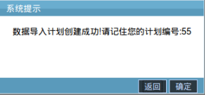 13.成功创建向系统中导入客户资料的任务时,系统会弹出“数据导入计划创建成功!请记住您的计划编号:XXX”的提示窗,如下图: