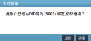 14.为DID号添加账户,如果账户已绑定DID号码,系统会弹出“此账户已经与DID号为(xxxx)绑定,仍然继续?”的提示窗,如下图: