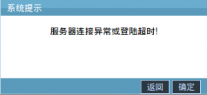 5.在长时间不操作系统页面,系统会弹出“服务器连接异常或登陆超时!”的提示窗,如下图: