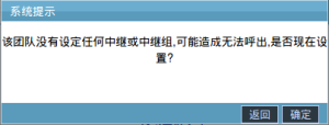 6.在团队没有绑定中继,双击团队信息进行编辑时,系统会弹出“该团队没有设定任何中继或中继组,可能造成无法呼出,是否现在设置?”的提示窗,如下图: