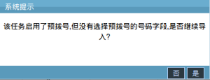 10.向具有预拨号功能的外呼营销任务导入数据,当未选择“预拨号电话”字段时,系统会弹出“该任务启用了预拨号,但没有选择预拨号的号码字段,是否继续导入?”的提示窗,如下图: