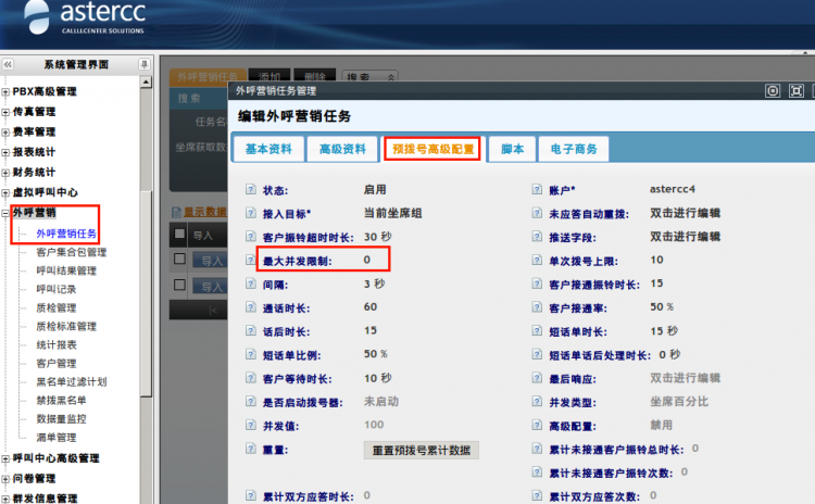 最大并发限制:该值可在外呼营销任务中进行设置,0代表没有限制。