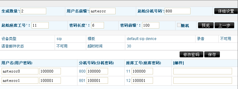 这样成功批量生成了两个已设置好的坐席和分机账号,点击修改密码,可以进行编辑修改,确定无误后点击【保存】
