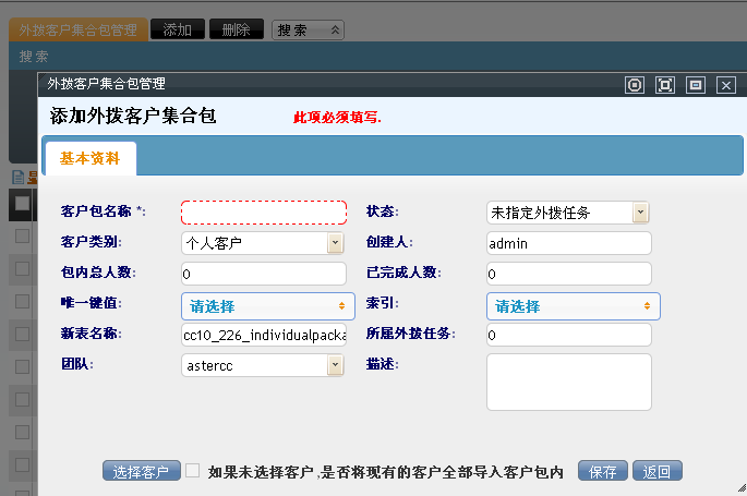 呼叫中心外拨管理–外拨客户集合包,打开添加客户包界面进行添加客户包