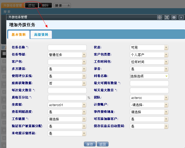 进入系统管理界面下,呼叫中心外拨管理–外拨任务管理,打开添加外拨任务界面: