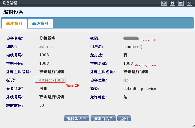 SIP账号即对应系统中所添加的一个类型为SIP的分机设备,进入系统,打开设备管理页面,双击一条设备记录打开如下界面: