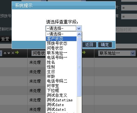同样查重字段选择的下拉框 也是根据 当前外拨营销任务的后台显示字段设置 而来
