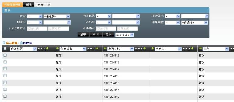 未处理和处理失败的任务(可根据状态字段进行搜索)都将显示在待发信息管理页面。你可以把此页面看作一个日志表。