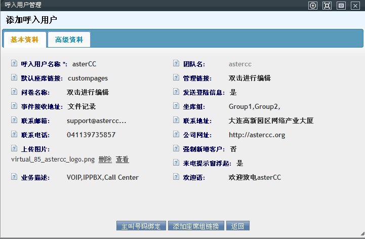 例如某公司在Astercc申请虚拟中心业务,该公司就是astercc的用户,他的业务分为技术咨询,产品真伪验证,代理咨询几个模块,在IVR语音中选择,业务选择的不同,就会有不同的坐席组为客户服务,当坐席振铃时,各组看到的页面不同(同一用户业务不同造成),所以要在此为各个组设置不同的弹屏链接地址。