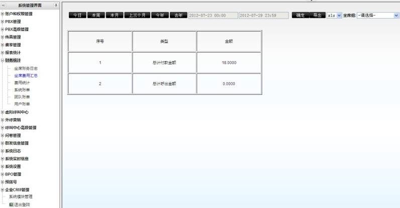 左侧管理列表 财务统计–>坐席费用汇总 ,进入下图所示页面。