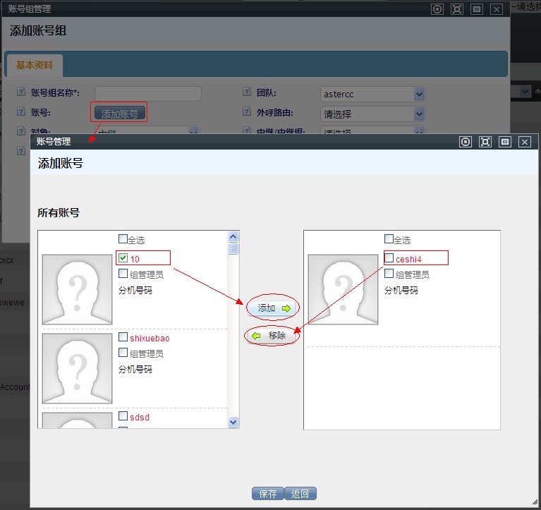 左侧列表里放着可加入到此帐号组的帐号,右侧列表里的帐号是帐号组内已有的帐号。