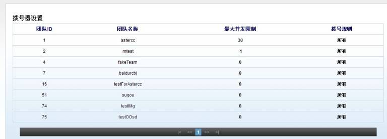 第二级团队并发限制,系统支持运营,可以多团队共存,系统管理员需要在预拨号设置页面为每个团队设置最大的并发值,-1代表无限制,0代表禁止并发,其它数字为并发量。