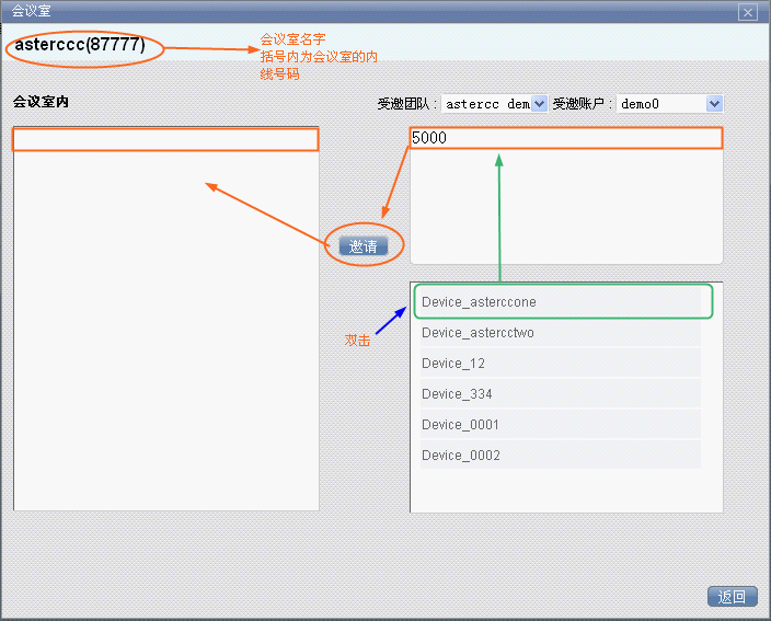 此页面左侧文本框内,表示此会议室内当前有多少个人在里面 通过选择 受邀团队下拉框 ,可以将团队关联的账户管理出来显示在右下角的文本框内,如上图所示,点击一条记录,便会将此账户关联的分机号显示在右上角的文本框内,此时可能按钮不能点击,请选择受邀账户,选择一个账户,此时邀请按钮就可以点击了,点击就可以将当前在右上角文本框内的号码都将邀请进去会议室。