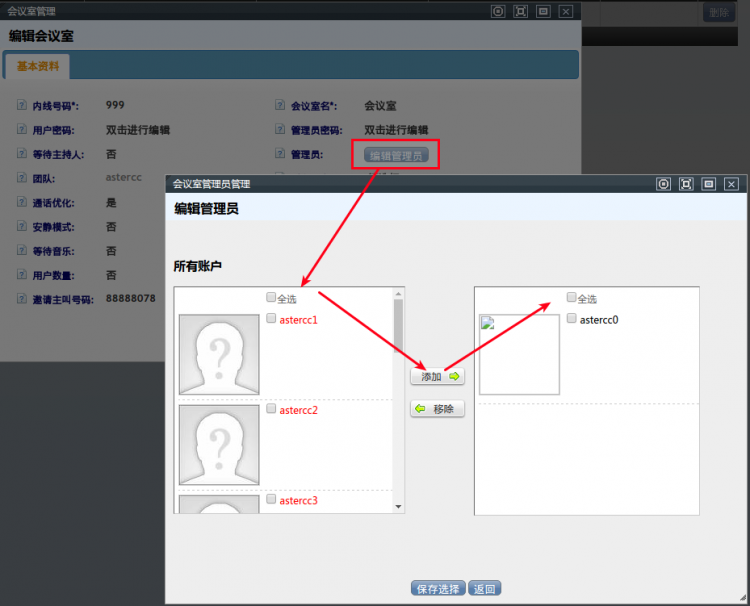 • 点击配置界面,管理员参数:【编辑管理员】按钮, 点击后会弹出来如下界面为该会议室添加管理员账户。