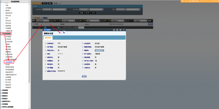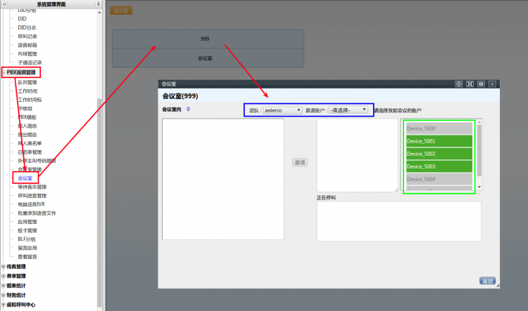 • 左侧管理列表,点击【PBX高级管理】 –> 【会议室】进入会议室界面,点击进入具体的会议室。蓝色方框为系统使用某账户发起邀请,绿色方框为系统内可邀请的内线分机,双击具体的分机选择邀请账户,点击【邀请】按钮向该分机发起邀请。