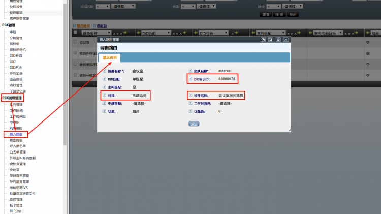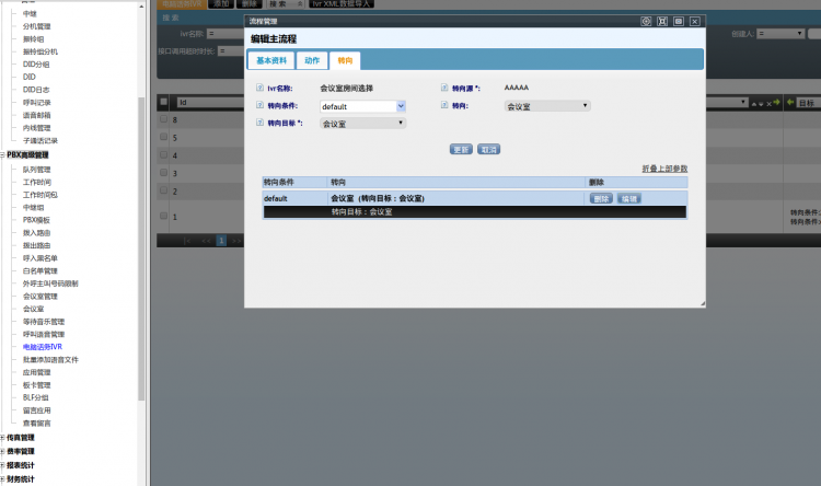 简介:左侧管理列表,点击【PBX高级管理】–>【会议室管理】进入下图所示页面,用于配置会议室,可通过邀请或通过拨入路由主动呼入实现多方通话。