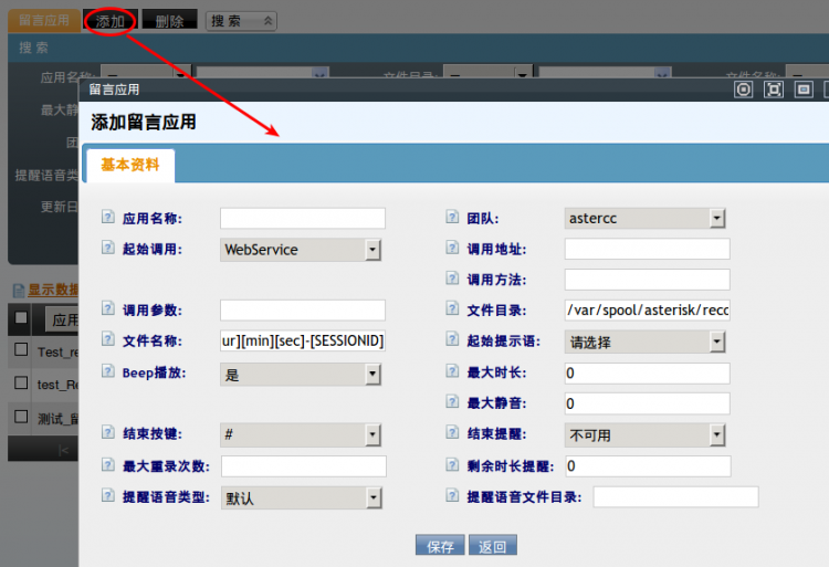 模块功能:创建留言应用,用以在IVR中进行调用,生成留言录音文件。