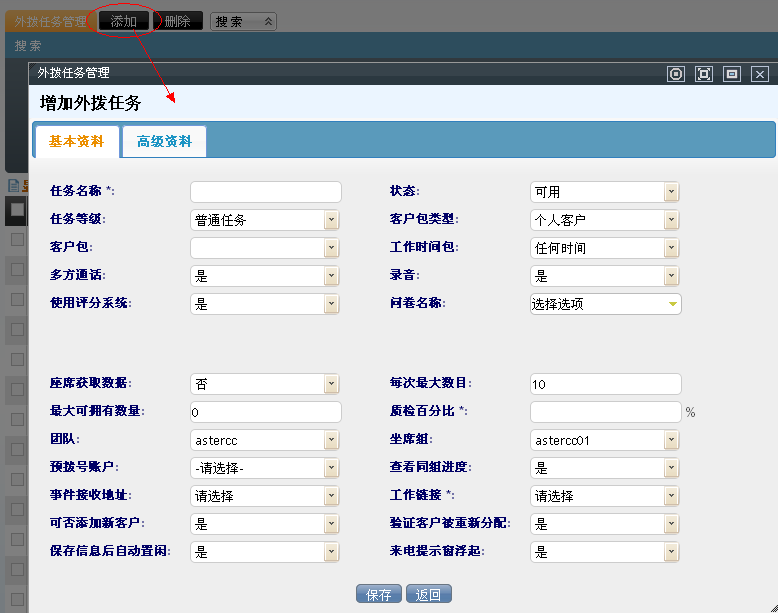 系统管理界面下,呼叫中心外拨管理–外拨任务管理,打开添加外拨任务管理界面,进行信息的设置