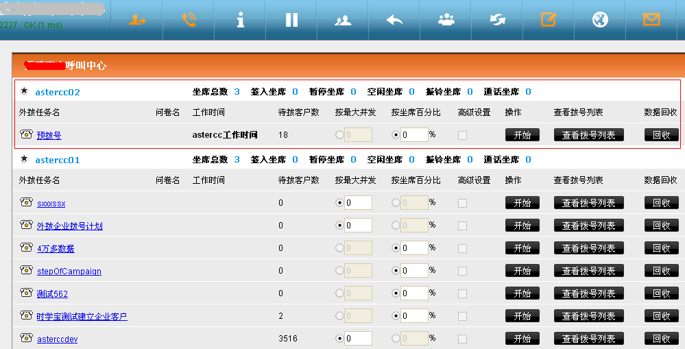 方框内“预拨号”即为所建外拨任务,分配给astercc02坐席组,下面我们来了解一些基本的字段含义