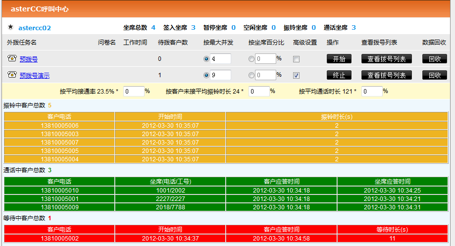 预拨号开始后我们可以看到在黄色方框里显示的是正在振铃中的客户数,绿色方框内的数据是坐席已经接听正在通话中的客户数,红色方框内的是客户已经接听等待坐席接听的客户数