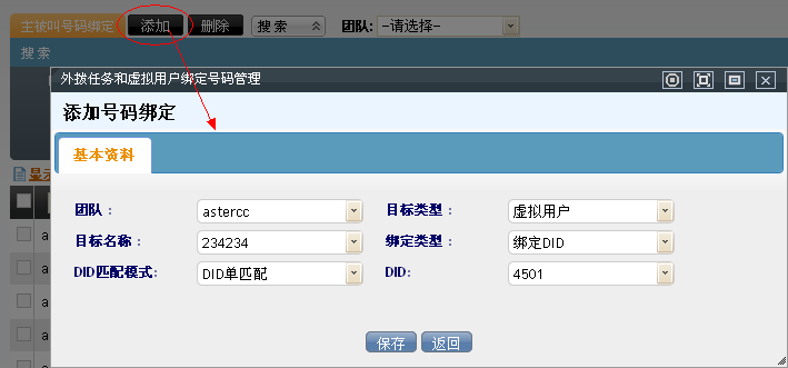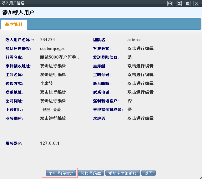 保存后会弹出一个界面,界面下方出现一个“主叫号码绑定”点击进入后,转到系统的呼叫中心高级管理下的主被叫号码绑定界面,进行主被叫号码绑定