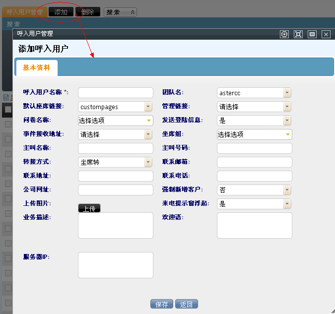系统管理界面下,呼叫中心呼入管理–呼入用户管理,打开添加呼入用户界面: