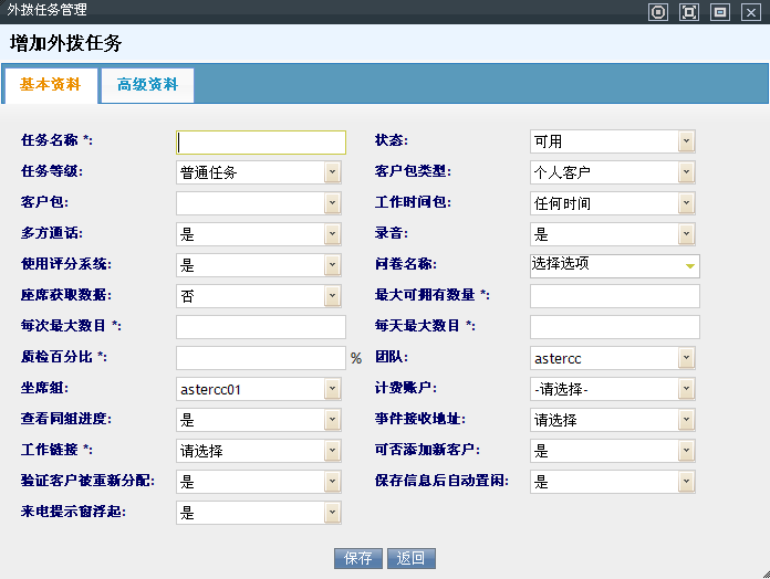 进入系统呼叫中心外拨管理下,外拨任务管理,打开添加外拨任务界面: