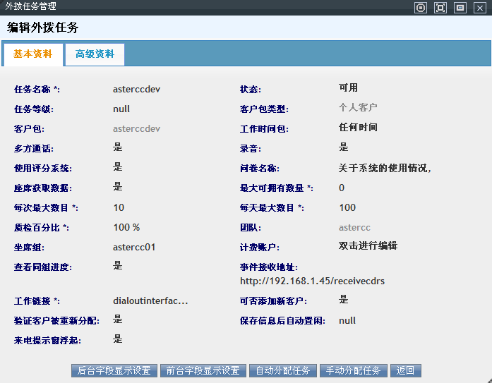 外拨任务是要分配给坐席组使用,坐席组内的坐席获取客户包里的数据,最大可拥有量:是指坐席最多可拥有多少个客户,每次最大数目:是指坐席一次可分配的最多客户数