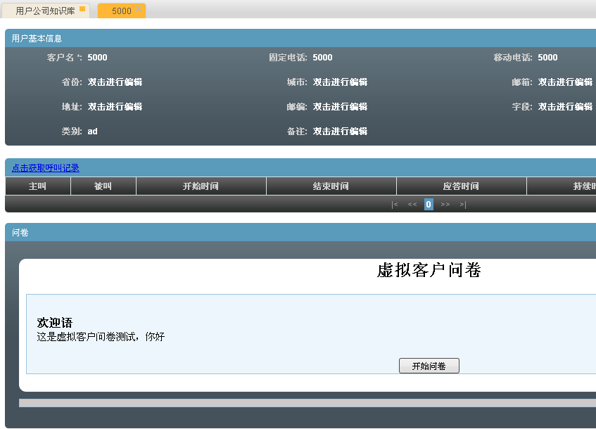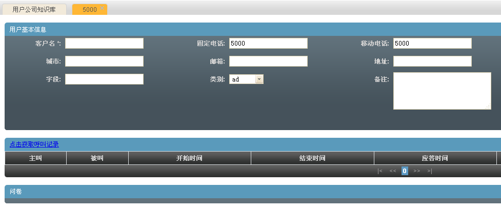 这样当电话呼入的时候会出现客户资料弹屏,如果呼入的电话首次拨入会列出输入该客户资料信息的文本框供坐席进行填写