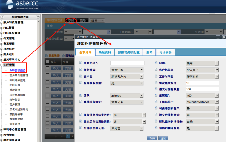 打开左侧管理列表,点击[ 外呼营销 ]→[ 外呼营销任务 ]页面中的[添加]按钮,进入外呼营销任务添加页面,如下图: