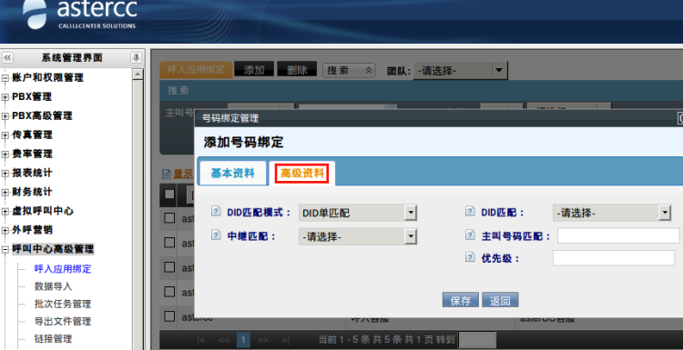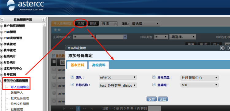 外呼营销任务创建完成之后,需要去呼叫中心高级管理下的呼入应用绑定界面去绑定主叫号码或DID号码