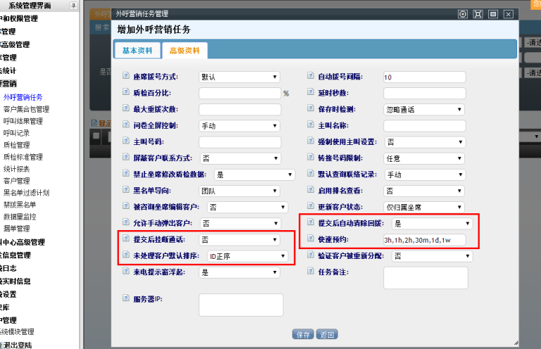 将 `验证客户被重新分配` 和 `来电提示窗浮起` 参数,做为 高级资料标签下的参数