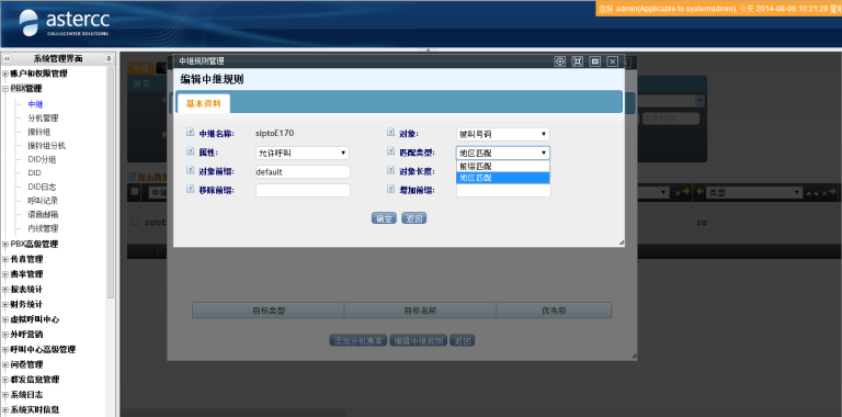 • 中继和中继组规则中允许根据归属地设定呼叫规则,如本地号码自动去0,或者根据被叫号码归属地选择中继